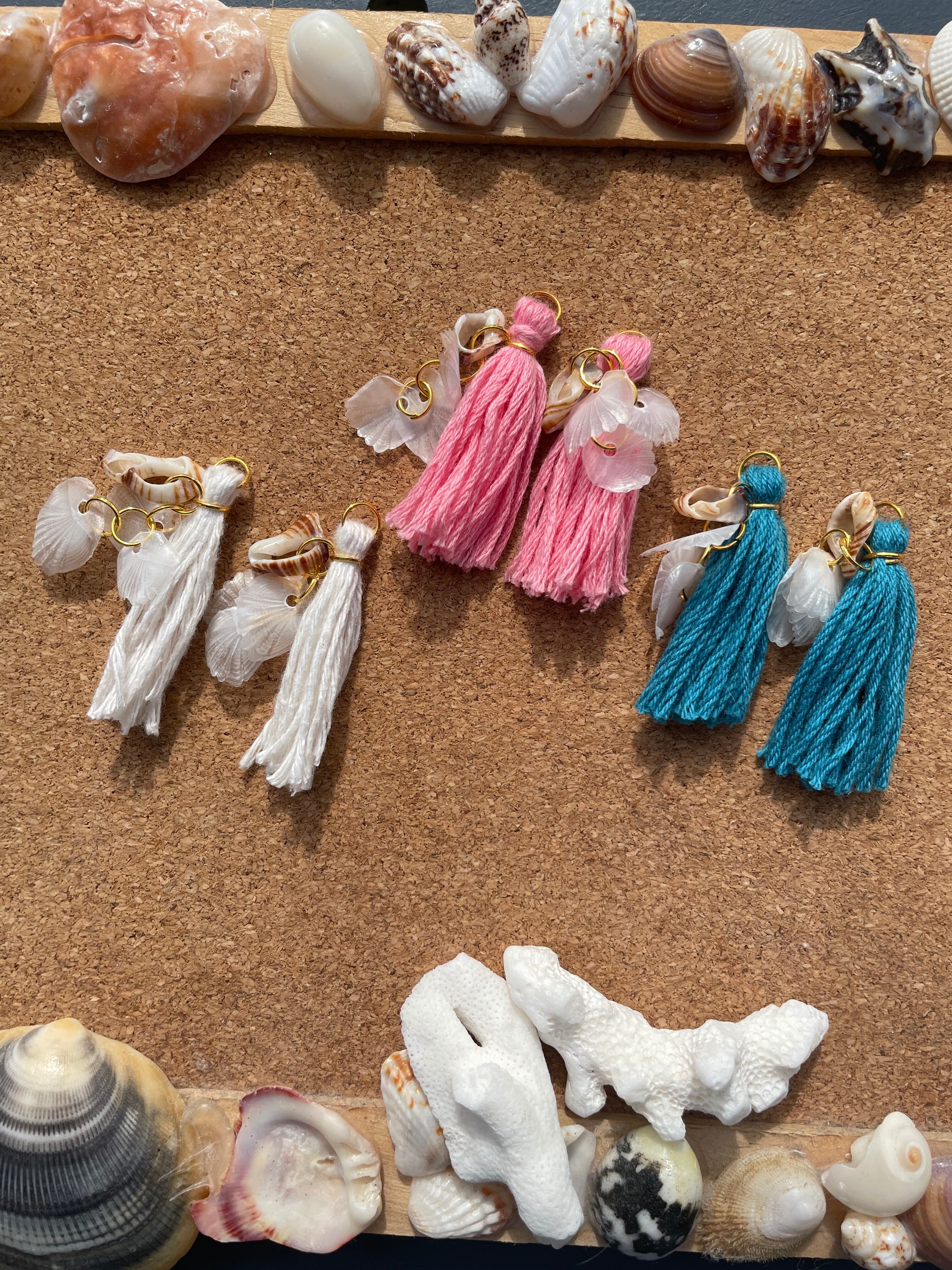 *3色の刺繍糸タッセルに、鯛のウロコとビーチで出会った素敵な貝殻を付けました